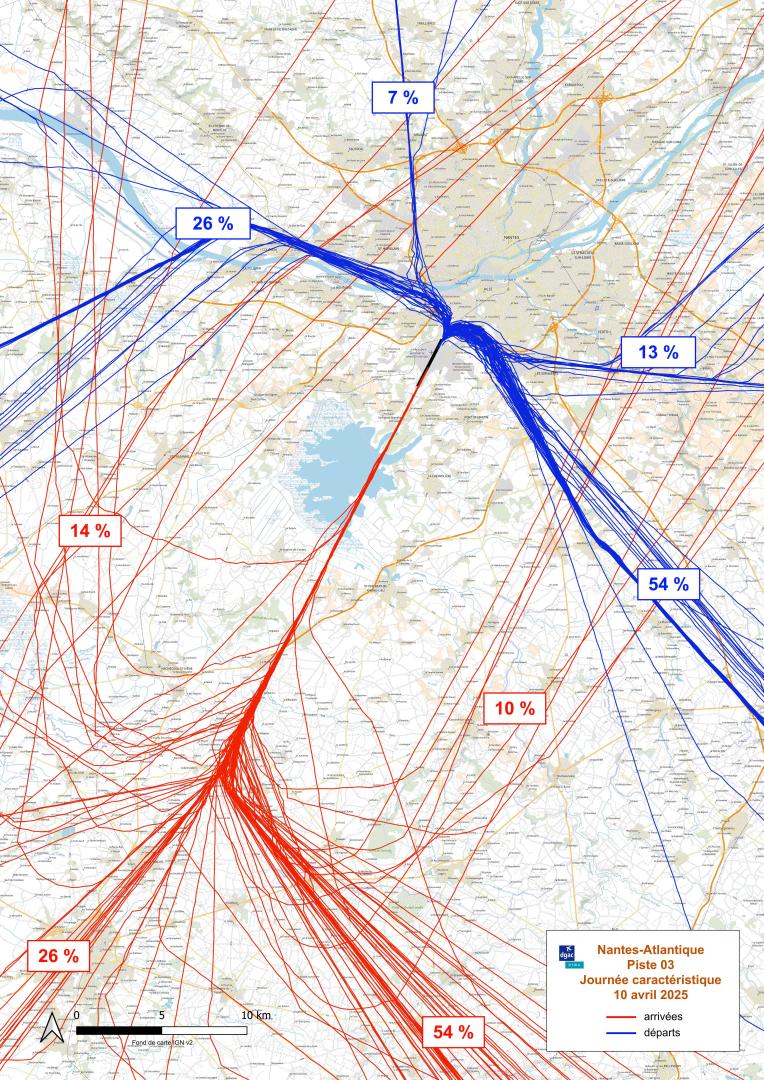 L’aéroport de Nantes-Atlantique dispose d’une piste unique (Piste 03/21), orientée selon un axe Nord-Est/Sud-Ouest. Les configurations « face au Nord-Est » et « face au Sud-Ouest» correspondent à deux dispositifs de circulation aérienne qui sont utilisés en fonction de la direction et de la force du vent sur cette plate-forme.