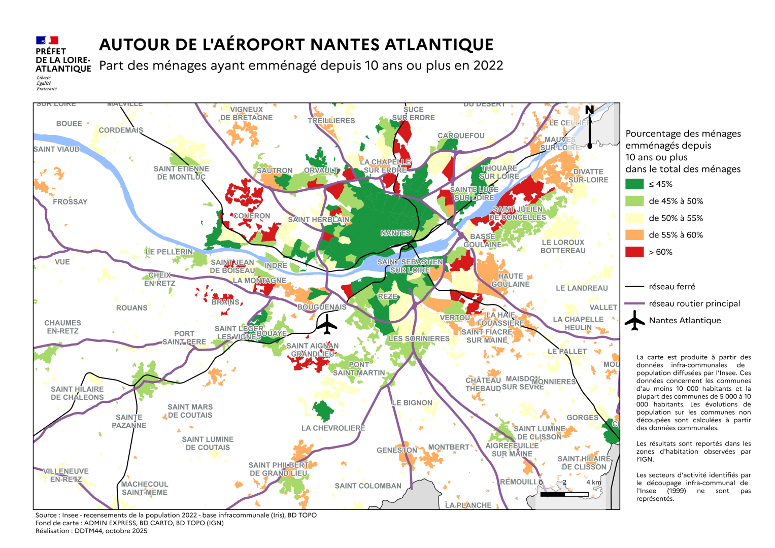 La carte ci-dessus et la suivante sont issues des données infra-communales du thème logement diffusées par l’Insee pour les communes de plus de 10 000 habitants. Les valeurs des indicateurs sont reportées dans les secteurs à dominante habitat observés par l’IGN. Les secteurs urbanisés à dominante d’activité économique ne sont pas représentés (cas à Rezé du secteur Insee de Trentemoult par exemple).