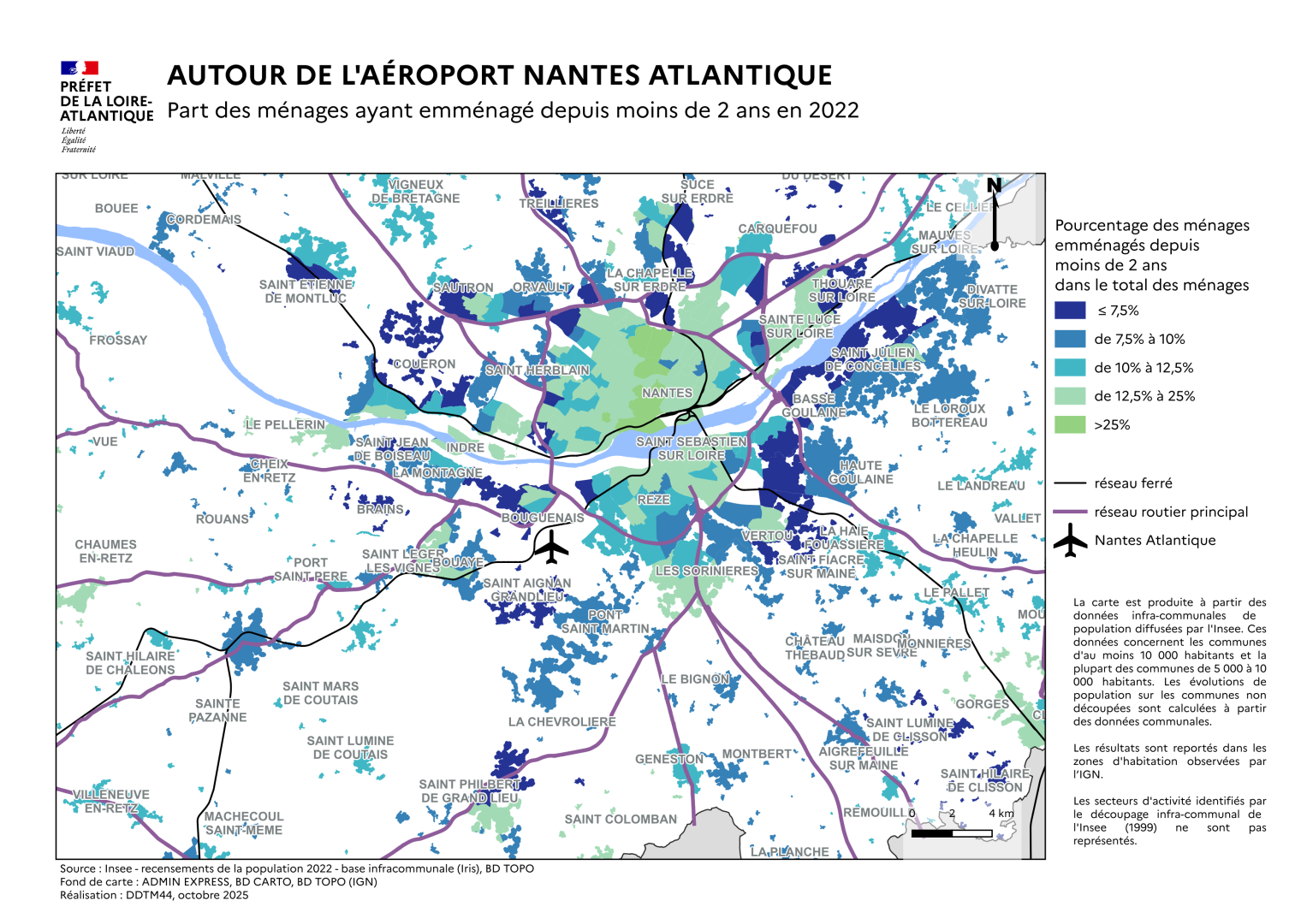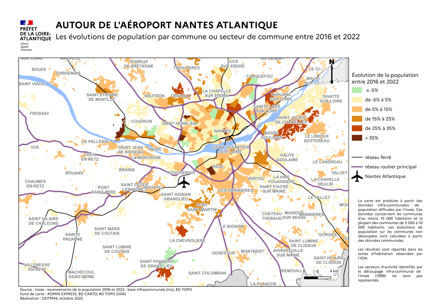 La carte est produite à partir de données infra-communales de population diffusées par l’Insee pour les communes de plus de 10 000 habitants. Les taux d’évolution de population ont été calculés à partir des données Insee de 2007 et de 2016 et reportés dans les secteurs à dominante habitat observés par l’IGN. Les secteurs urbanisés à dominante d’activité économique ne sont pas représentés (cas par exemple à Rezé du secteur Insee de Trentemoult).